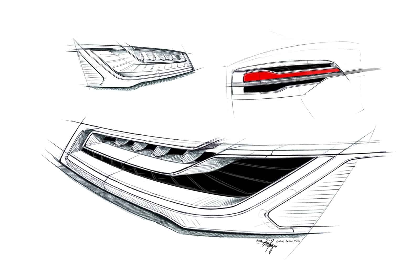A travers ces différents croquis, on y aperçoit le léger restylage notamment au niveau de la calandre avant, des phares et feux arrières. Les phares cybernétiques de cette nouvelle Audi A8 ont même droit à des croquis dédiés.
