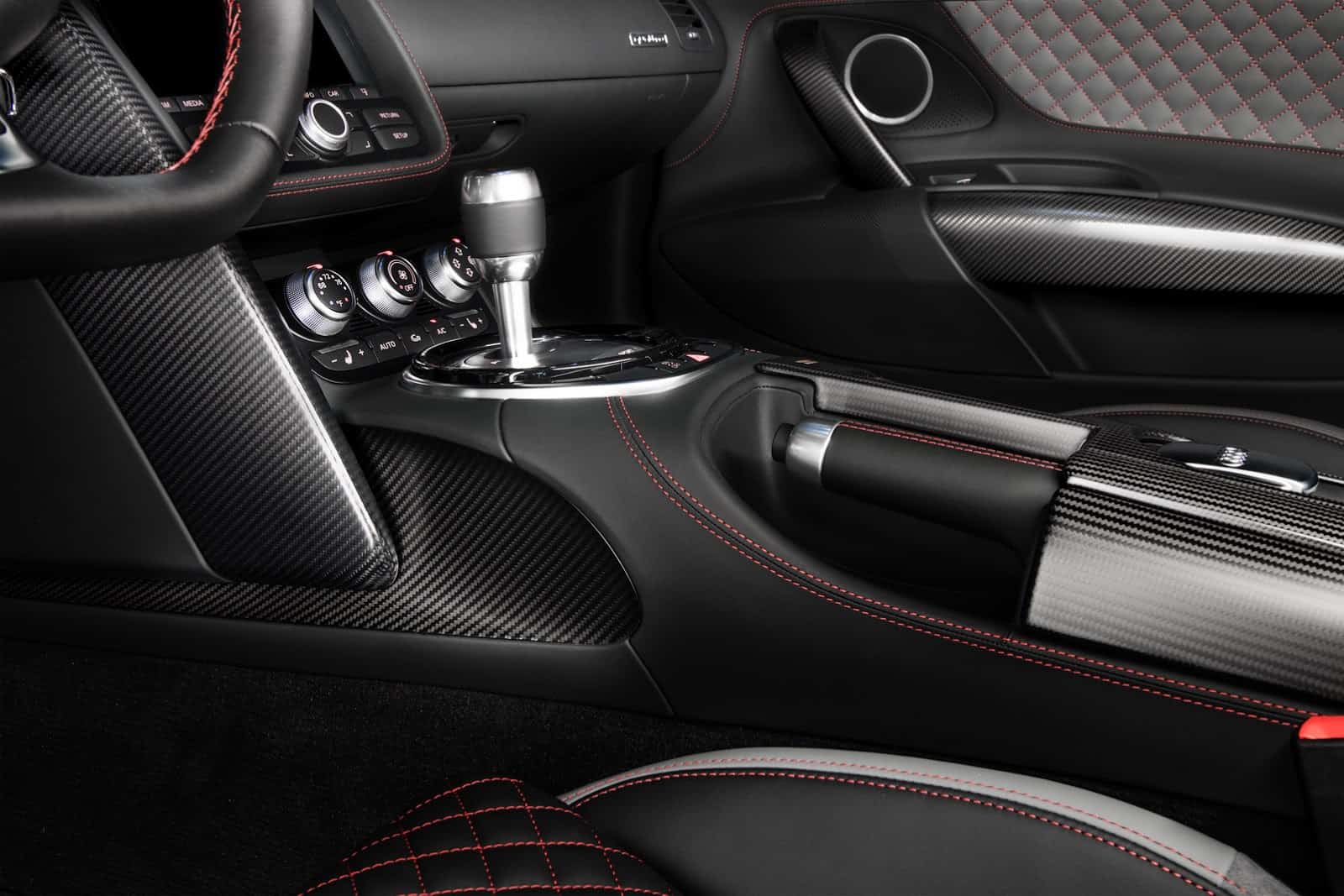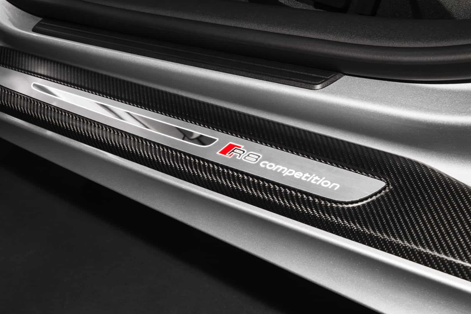 L’intérieur, quant à lui aussi, se dote de carbone notamment au niveau des garnitures de portes. On mentionne au passage les seuils de portes illuminées « R8 Competition ».
