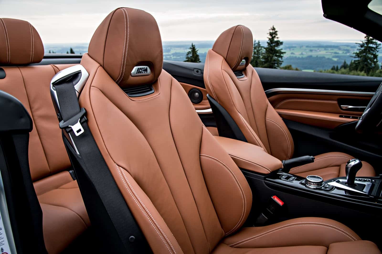 Les sièges siglés ///M à bord de cette M4 CabrioletEsthétiquement, les composantes de la M4 Coupé sont présentes. Seule différence reste le toit rétractable en 20 secondes, il peut être enlevé ou remis en place pendant que la voiture roule et ce jusqu’à une vitesse de 18 km/h.