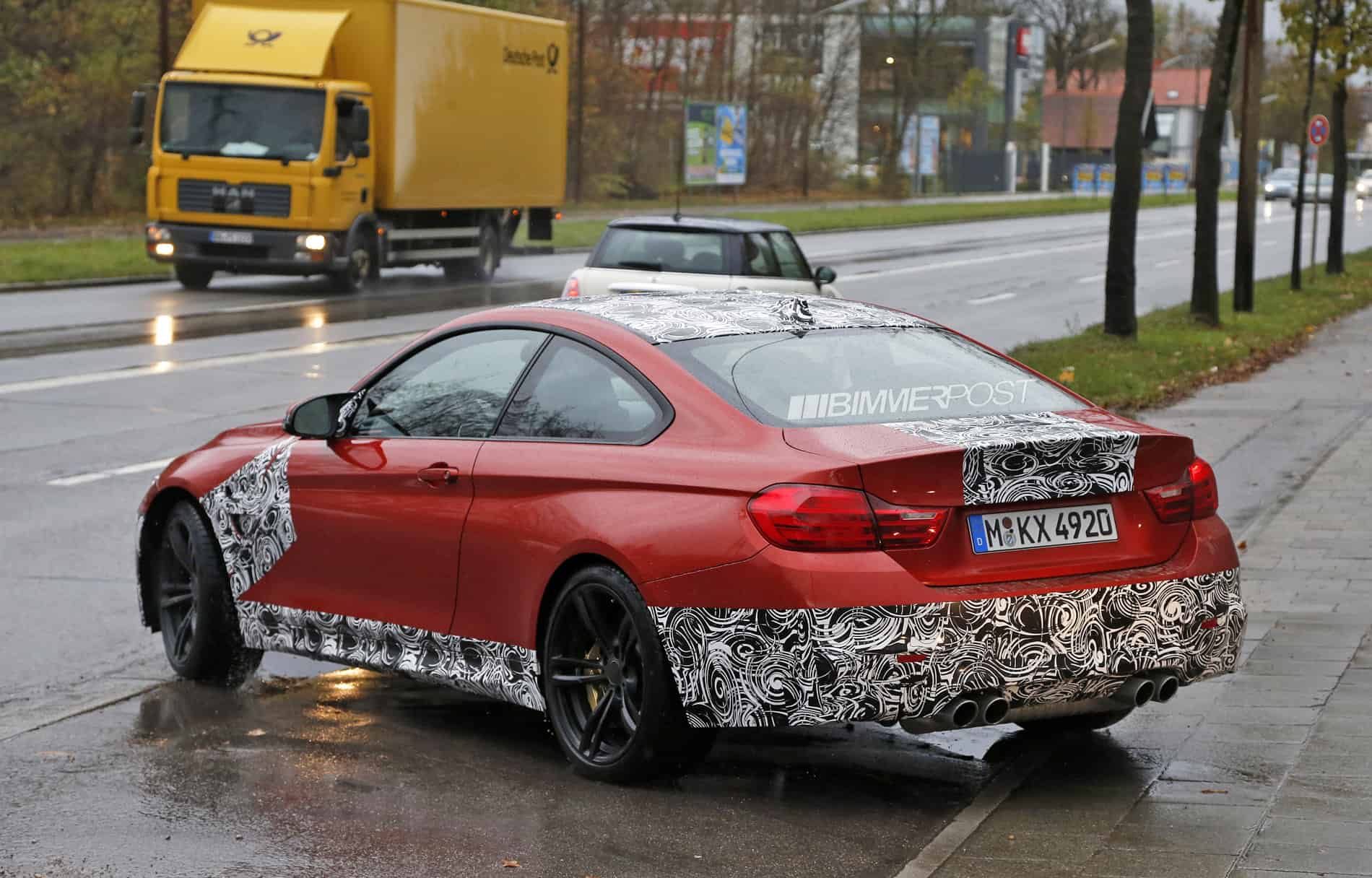 L’Orange Sakhir a été, en effet, aperçu sur un mulet de test de la M4 Coupé légèrement camouflée sur le toit, les jupes latérales, les ailes avant et les pare-chocs avant et arrière. On retrouvera, notamment, un toit en fibre de carbone et 4 sorties d’échappement sur cette M4 mais aussi sur la berline M3.