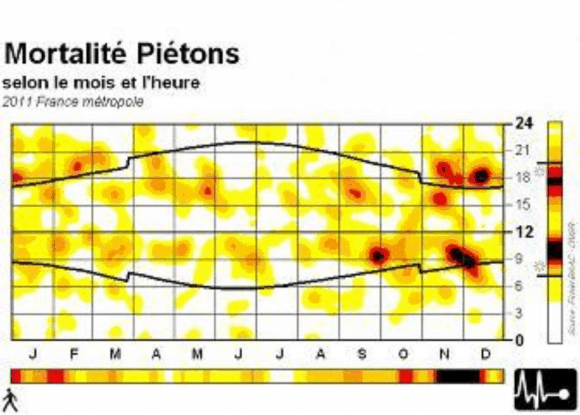 Les décrochements dans les courbes noires haute et basse correspondent aux changements d’heure. Les zones les plus sombres concentrent le plus grand nombre de décès de piétons (source ONISR).