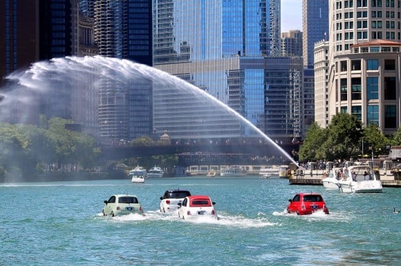 Fiat continue la promotion de sa petite citadine, la Fiat 500, aux Etats-Unis. Au lieu de choisir la voie terrestre, le constructeur italien a préféré passer par les eaux.