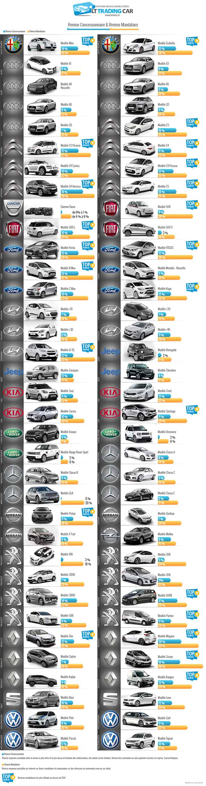 A l’aide de l’infographie ci-dessous, découvrez d’autres modèles bénéficiant de remises conséquentes en faisant appel à un mandataire ou comparez simplement les taux de remises accordées pour votre future « titine » :