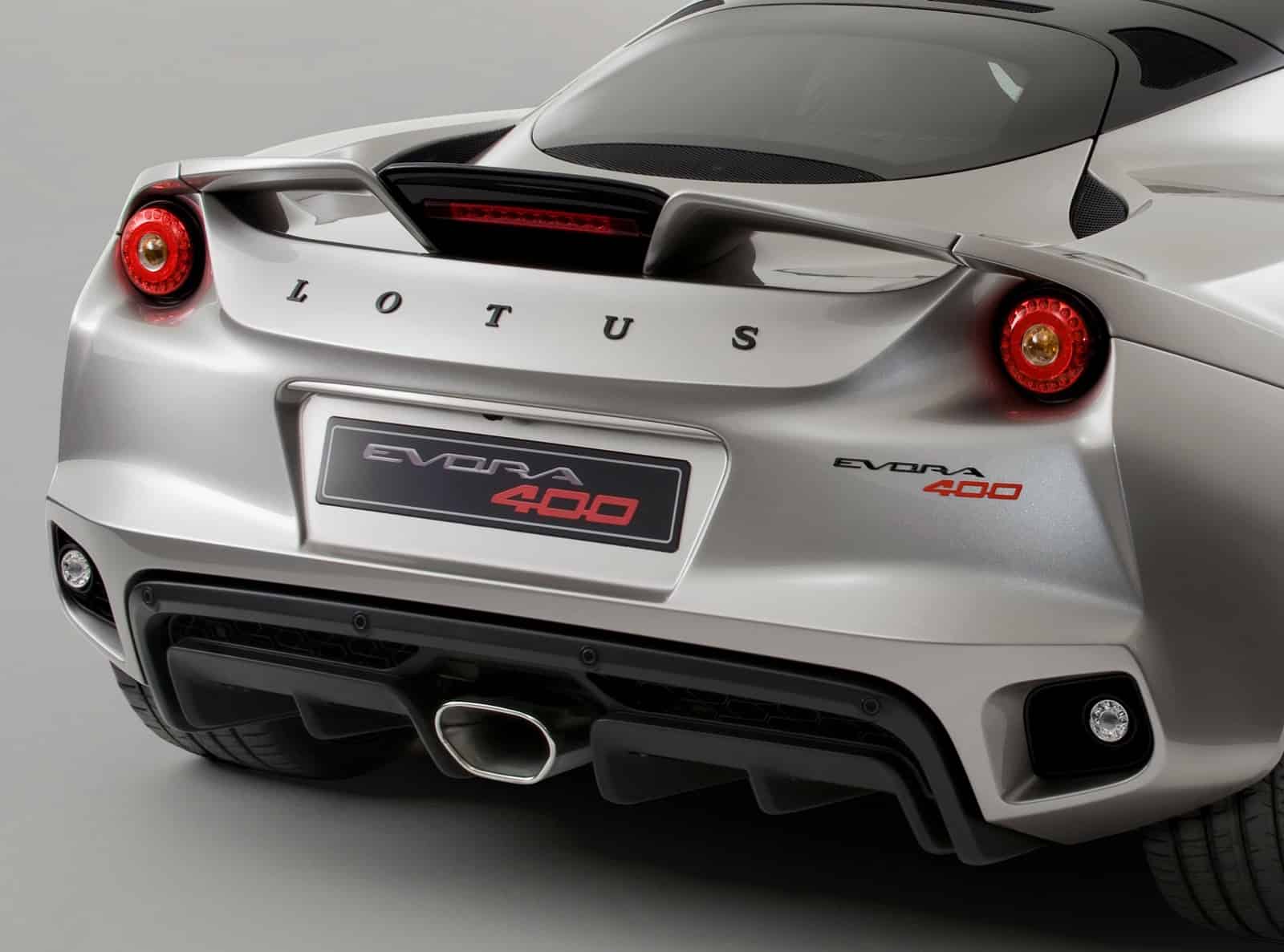 Comparée à l’Evora S, cette version 400 se veut complètement différente puisqu’elle reçoit un nouveau châssis et des faces avant et arrière totalement modifiées. En détails, l’Evora 400 s’allège de 22 kg pour afficher un poids total de 1 415 kg à vide et également s’allonge de 35 mm.