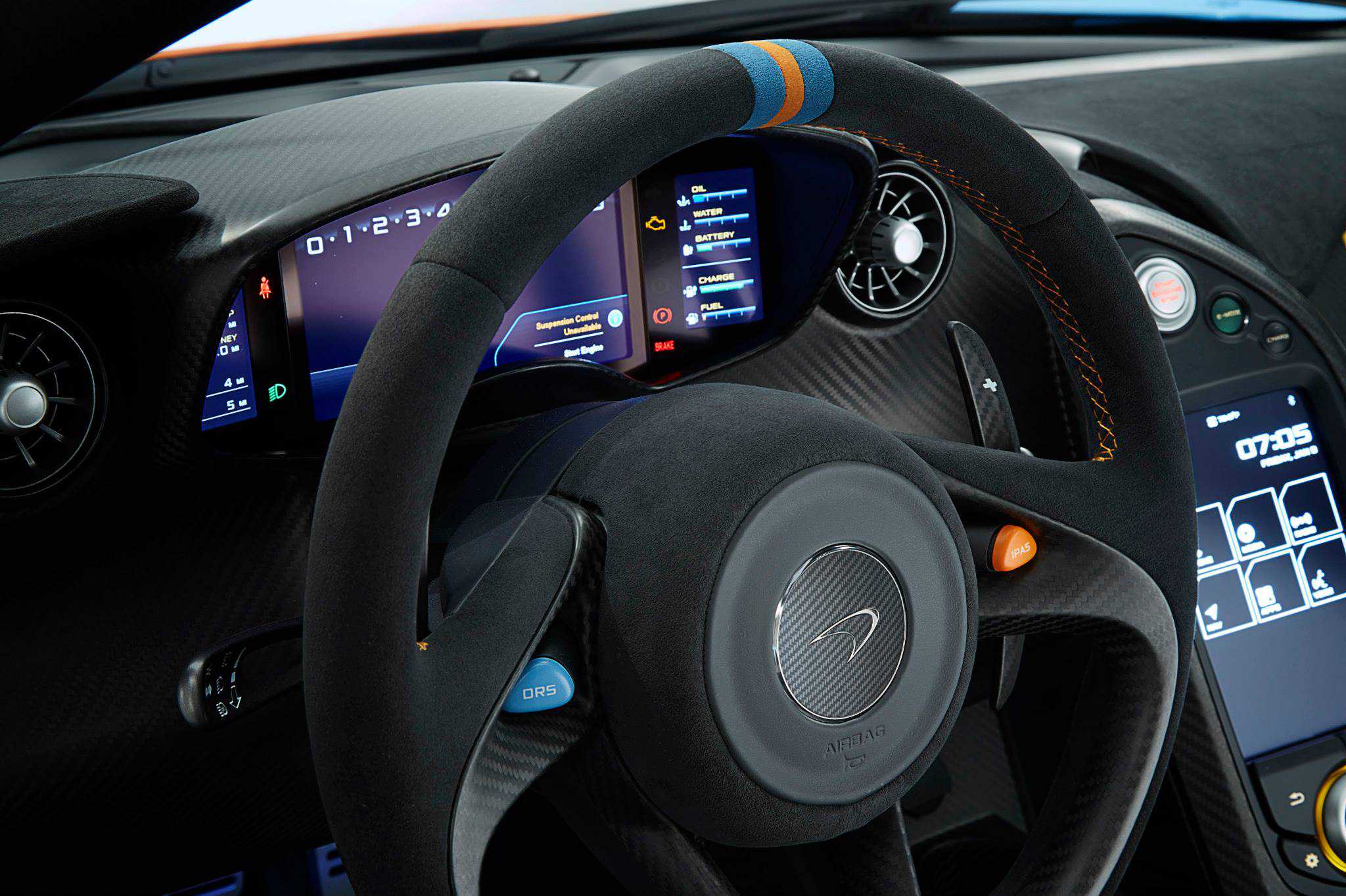 Outre l’aspect extérieur, la touche Gulf est également présente à bord avec un volant incluant un repère haut (à midi) bleu et orange, des surpiqûres oranges sur les sièges ainsi qu’au niveau des boutons de démarrage du bolide parés de bleu et d’orange, une couleur pour chaque bouton.