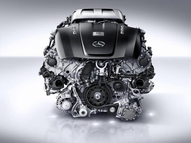 Comme on le sait déjà, la rivale des Porsche 911 embarquera un tout nouveau V8 4.0 l – identique à celui de la C63 AMG 2015 – équipé de 2 turbos placés entre les deux bancs de cylindres. Ce placement a permis de proposer un bloc plus compact et un gain de place, il ne pèserait que 209 kg selon le constructeur à l’étoile. Ce 8 cylindres en V délivrera 510 chevaux et 650 Nm de couple.