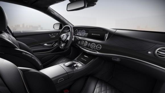 Dans l’habitacle de cette Mercedes S63, la grosse berline allemande adopterait de la fibre de carbone, qui pourrait être présente sur les panneaux de portes ainsi que sur le tableau de bord.