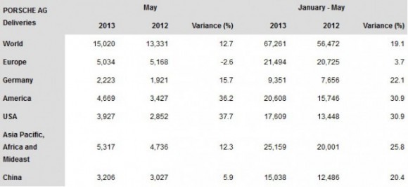 La plus haute augmentation s’est produite aux Etats-Unis, il y eu une hausse de 37,7% (3 927 Porche écoulées en mai 2013 contre 2 852 en mai 2012) mais l’Allemagne n’est pas loin derrière, le pays connait une augmentation de 15,7% par rapport à mai 2012.