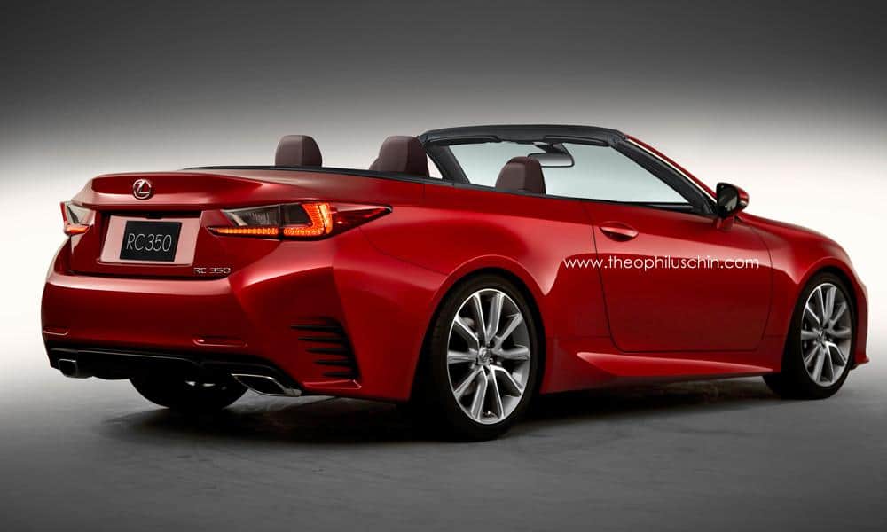 Moins de deux jours après la présentation du Lexus RC Coupé, Theophilus Chin réalise un rendu d’une version Cabriolet du RC. Le designer virtuel n’a pas chômé et intègre sur ce RC Cabriolet un toit en toile noir afin de ne pas dénaturer la ligne de la voiture.