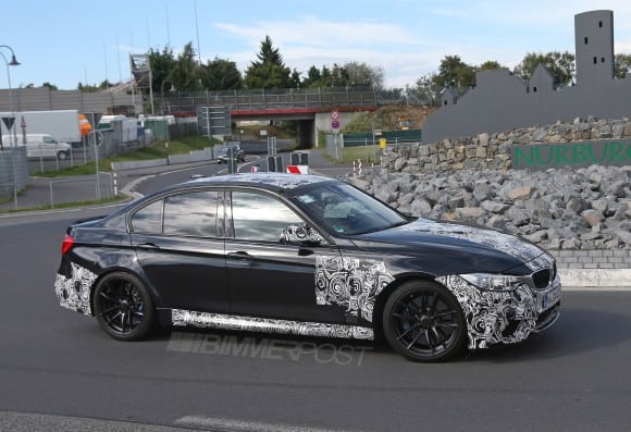 Le camouflage s’éclipse au fil du temps et on s’aperçoit que cette M3 reprend de nombreux élements du concept M4 Coupé et de la future M4 : phares avant, pare-choc arrière, jupes latérales, capot gonflé, 4 sorties d’échappement, un toit en fibre de carbone, les jantes et la motorisation – six cylindres en ligne 3.0 l d’environ 450 chevaux – ainsi que la transmission.