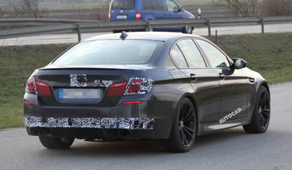 Les photographes d’Autocar ont capturé deux clichés de la future BMW M5 prévue pour 2014. Aperçue en Allemagne, cette BMW M5 est très peu camouflée (face avant et arrière uniquement) et cela nous surprend car ce n’est pas dans les habitudes de BMW.