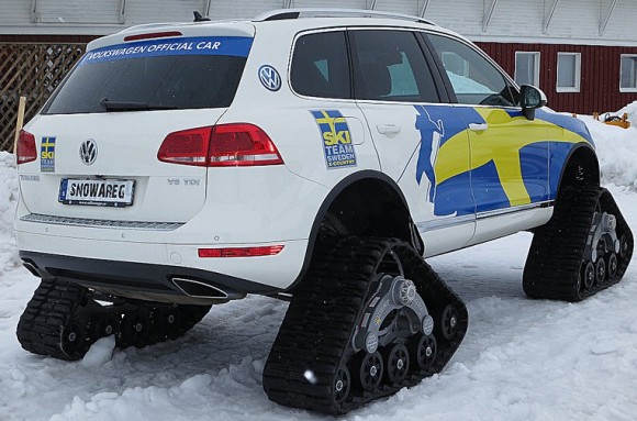 Il s’agit tout simplement du Touareg de Volkswagen équipé de pneus modifiés, similaires à ceux des chasse-neige. Cette trouvaille nous vient de Volkswagen Suède qui a décidé de présenter une nouvelle version de son Touareg prêt à affronter l’hiver.
