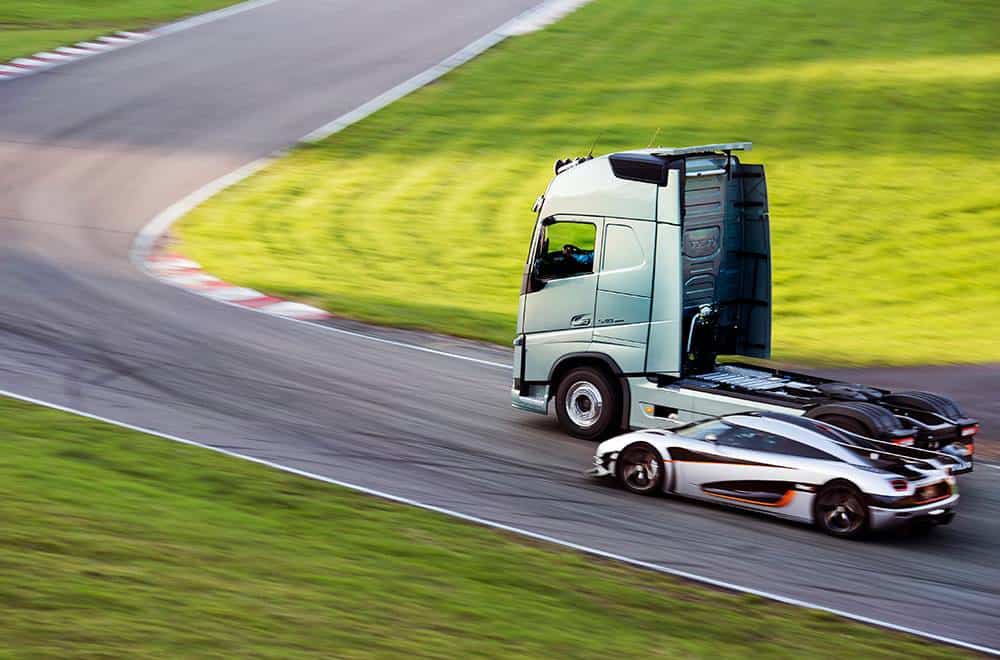 Le duel aussi improbable qu’il soit a finalement eu lieu ! Le Volvo FH a bien affronté – sur un circuit en Suède – la Koenigsegg One:1, découvrez ci-dessous la vidéo de cette course !