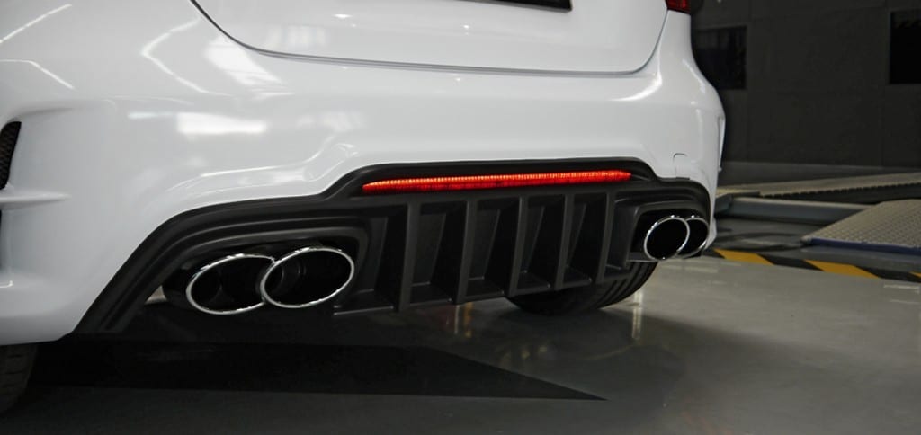 Le diffuseur intègre un feu stop central et englobe 4 sorties d’échappement. Merci Wald Int.class